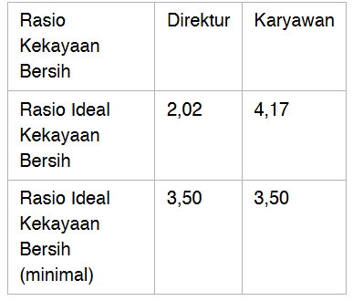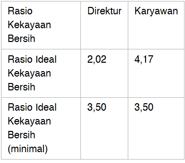 Jadi ternyata sang Direktur tidak lebih kaya dari sang Karyawan karena Rasio Kekayaan Bersih Direktur hanya 2,02 (mungkin memiliki utang yang besar disertai dengan gaya hidup yang mewah), sedangkan sang Karyawan memiliki Rasio Kekayaan Bersih yang lebih baik dari standar minimum yaitu sebesar 4,17. Jangan menyalahkan diri anda jika rasio belum tercapai, ini adalah merupakan langkah awal untuk melakukan perencanaan keuangan, usahakan rasio minimal sebesar 3,50 dapat tercapai sejalan dengan perkembangan waktu.